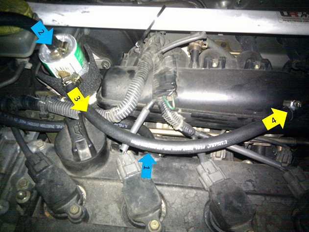 Here's the pictures. The color coded ones are Blue(1) - PCV to Blue(2) Inlet OCT to Yellow(3) Outlet OCT to Yellow(4) Inlet Intake Manifold.